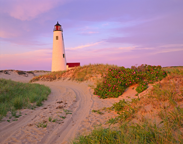 45-SUNA55 Published July 8, 2013 at 600 × 473 in 45-SUNA55 Late Evening Light at Great Point Light with Roses (Rosa rugosa) in Bloom along Access Road, Nantucket National Wildlife Refuge, Nantucket, MA Original: 4×5 inch color transparency