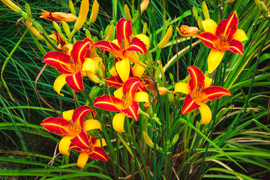 D-GFL55 Published April 21, 2014 at 864 × 576 in D-GFL55 Close Up of Red and Yellow “Frans Hals” Daylilies in Garden, Martha’s Vineyard, Tisbury, MA