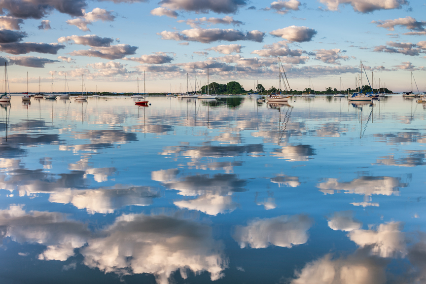 D-SSCTC77A Published July 1, 2014 at 864 × 576 in D-SSCTC77A Sky Filled with Cumulus Clouds Reflecting in Calm Water of Pine Island Bay in Early Morning Light, off Fishers Island Sound, Groton, CT