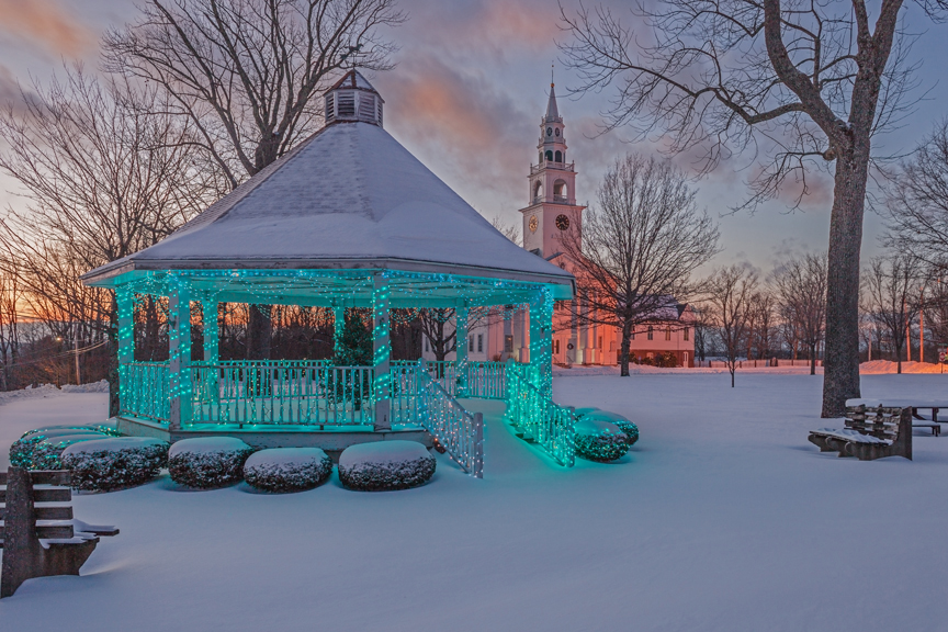 D-SSMS31C Published January 24, 2014 at 864 × 576 in D-SSMS31C Gazebo with Holiday Lights at Sunset with First Church of Templeton on Templeton Common after Snowstorm, Templeton, MA