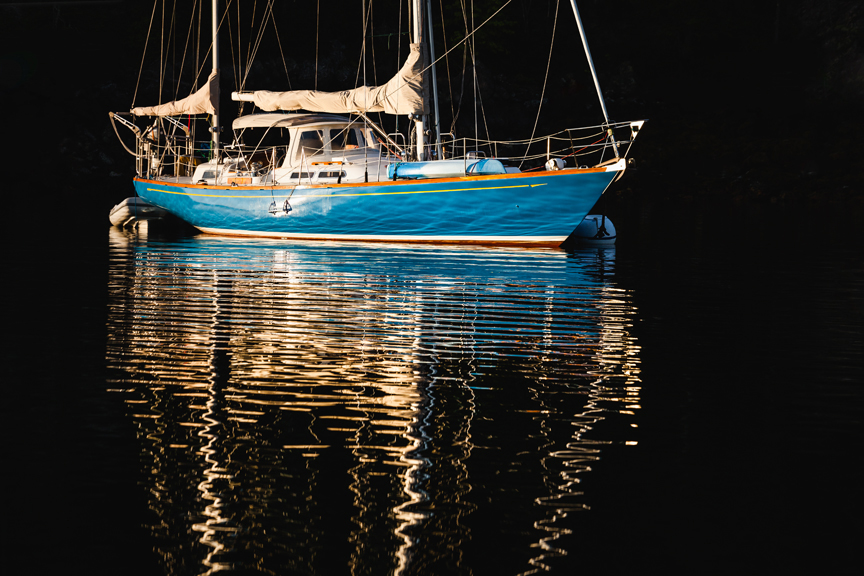 D-SUMC363 Published November 13, 2014 at 864 × 576 in D-SUMC363 Early Morning Light Shines on the Yawl “Mug Up” in Cookie Bite Cove (Gallery Point Cove), Bartlett Island, Mount Desert, ME