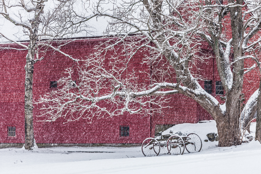 D-WFB123 Published January 24, 2014 at 864 × 576 in D-WFB123 Red Barn, Maple Tree, and Old Wagon in Snowstorm, Sudbury, MA