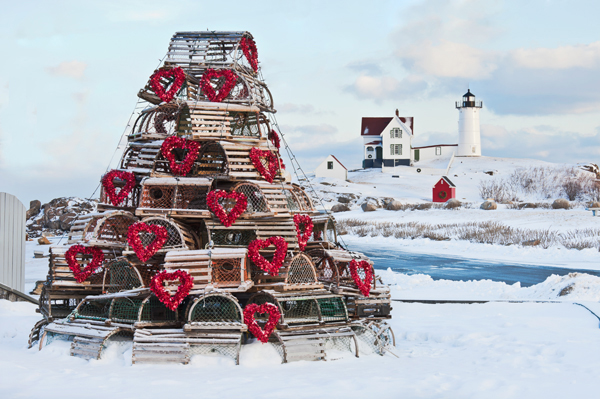 DS-WMC6 Published July 8, 2013 at 600 × 399 in DS-WMC6 Lobster Trap Tree with Red Heart Wreaths at Nubble Light (Cape Neddick Light) after Snowstorm, Cape Neddick, York, ME