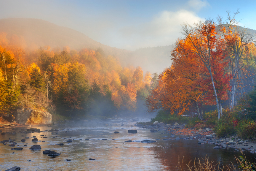D-FAD16 Published January 29, 2015 at 864 × 576 in Home Sun Shining Through Early Morning Fog over West Branch Ausable River in Fall, Sentinel Range Wilderness, Adirondack Park, North Elba, NY
