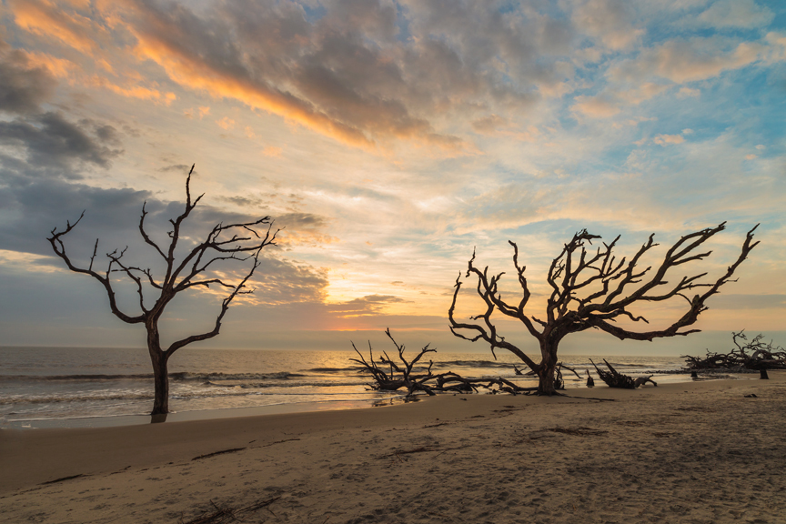 D-SSGAC14 Published May 26, 2013 at 864 × 576 in Home Driftwood Beach Clearing Skies at Sunrise over Old Snags on Driftwood Beach, Jekyll Island, GA